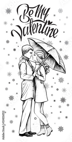 Couple In Love Under Umbrella Black And White Hand Drawn Sketch